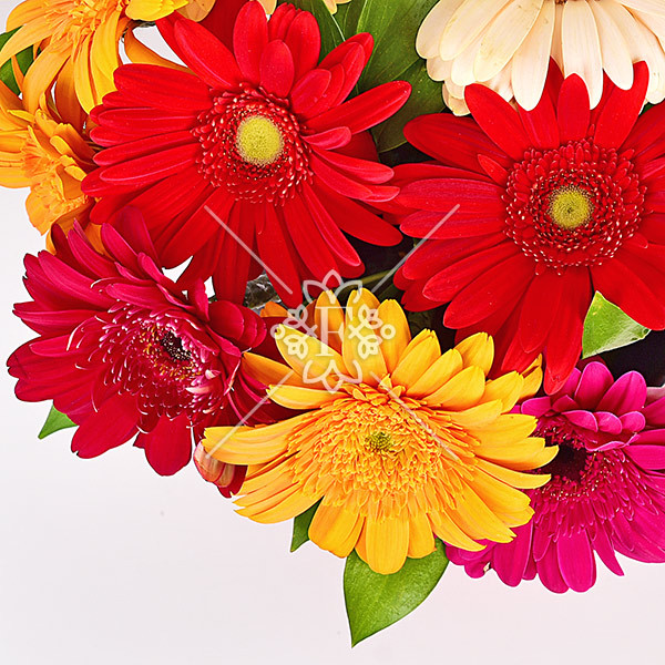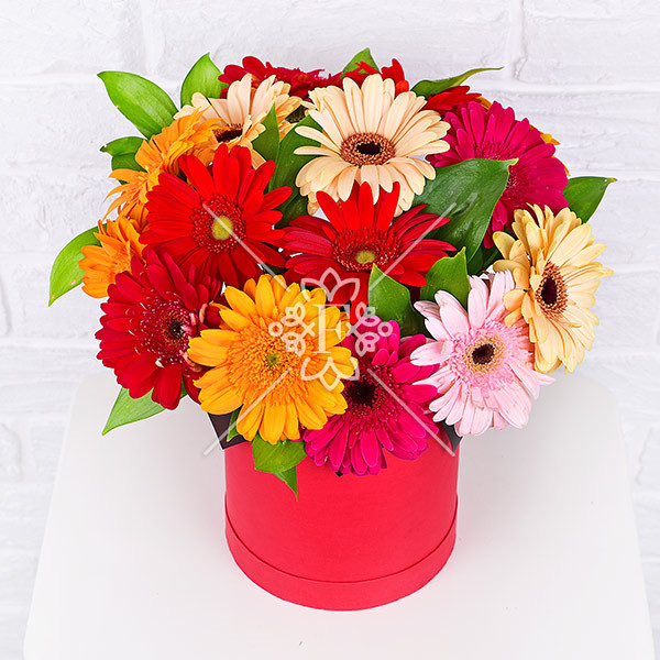 гербера разноцветная - 17 шт., зелень декоративная, оазис, коробка. Примерный размер: 25Х30 см.