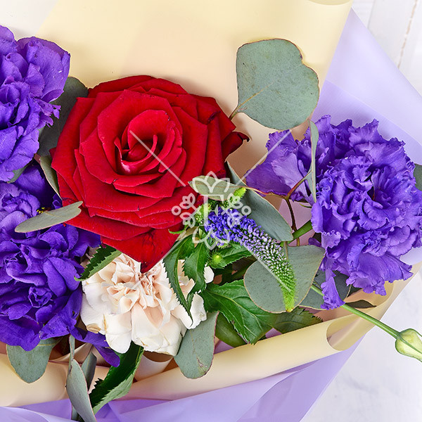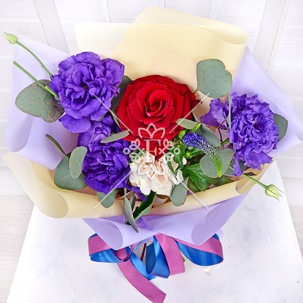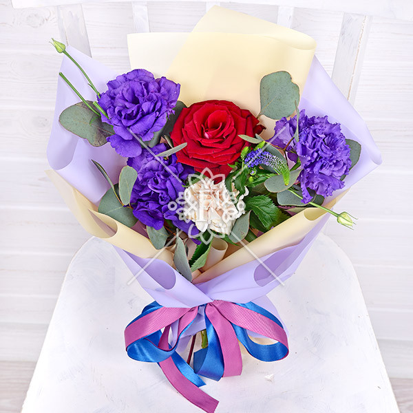 Роза красная – 1 шт., эустома фиолетовая-1 шт.,  гвоздика кремовая – 1 шт., декоративная зелень (вероника, эвкалипт), упаковка, лента.