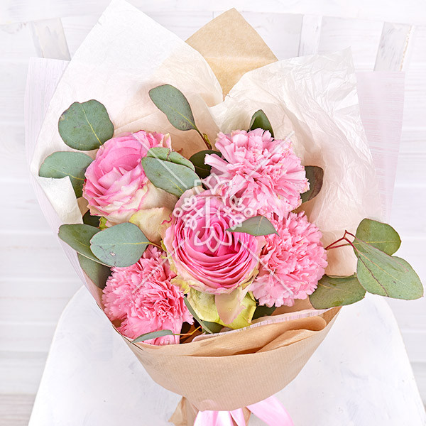 Роза розовая – 2 шт., гвоздика розовая – 3 шт., эвкалипт – 1 шт., упаковка, лента.